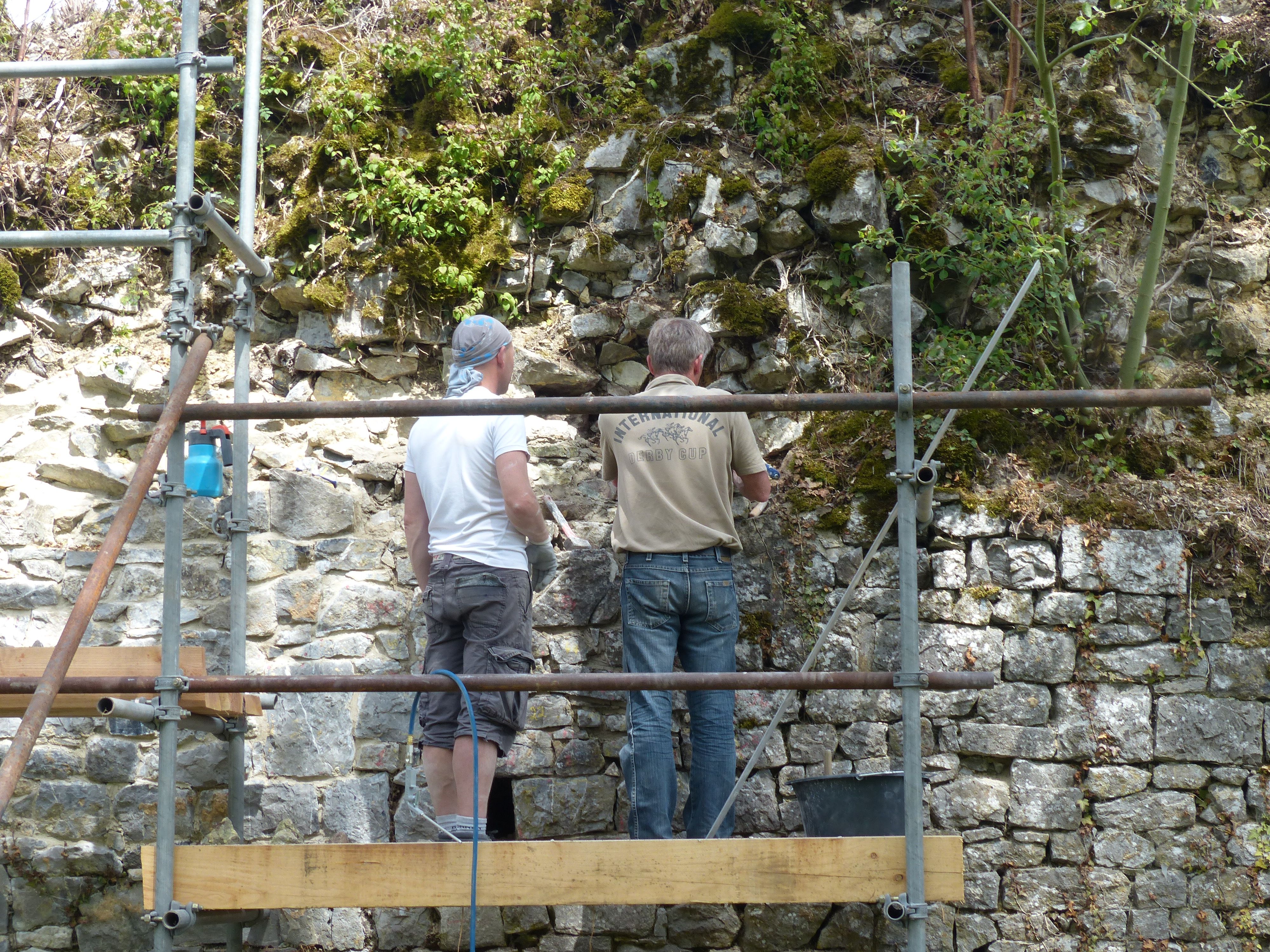 Voilà bientôt deux semaines qu’une partie des murailles orientales du château ainsi que certains pans des murailles intérieures du château font l’objet d’un double chantier de restauration. Après une équipe de stagiaires de la Paix-Dieu (Institut du Patrimoine wallon), Jacques de Pierpont a accompagné et guidé les travaux de quelques bénévoles de l’ASBL « Les Amis de Poilvache » et d’un collaborateur de la Maison du Patrimoine Médiéval Mosan (MPMM).