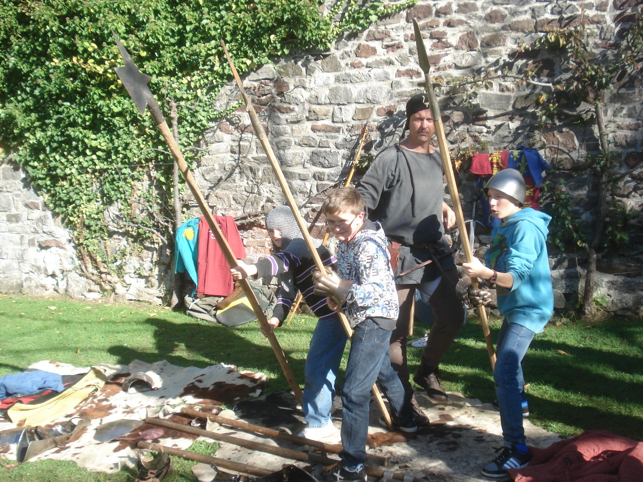 Après la découverte, en matinée, du musée de la haute Meuse préhistorique, de la bibliothèque communale et de l’ancienne forge, nous avons accueilli les enfants avec un court montage vidéo présentant en images et musique les activités de l’ASBL. Michèle Barcena-André, notre présidente, a ensuite présenté la belle maquette de la forteresse, l’histoire de Poilvache et les activités de notre ASBL. Ce fut ensuite le tour de Marie-France Elias-Libois de conter aux enfants la célèbre légende des « peaux de vache ». Mais la cerise sur le gâteau fut incontestablement la rencontre avec l’inoubliable Torcol (aussi connu sous le nom de Jean-Pierre Willame), un chevalier-instructeur, sorti tout droit du Moyen-Âge. Ce tonitruant personnage forma en un tour de mains nos visiteurs du jour au métier des armes (médiévales…)! Une magnifique expérience pour nos jeunes Yvoiriens mais aussi pour les membres de l’ASBl qui eurent le plaisir de participer à l’événement !
