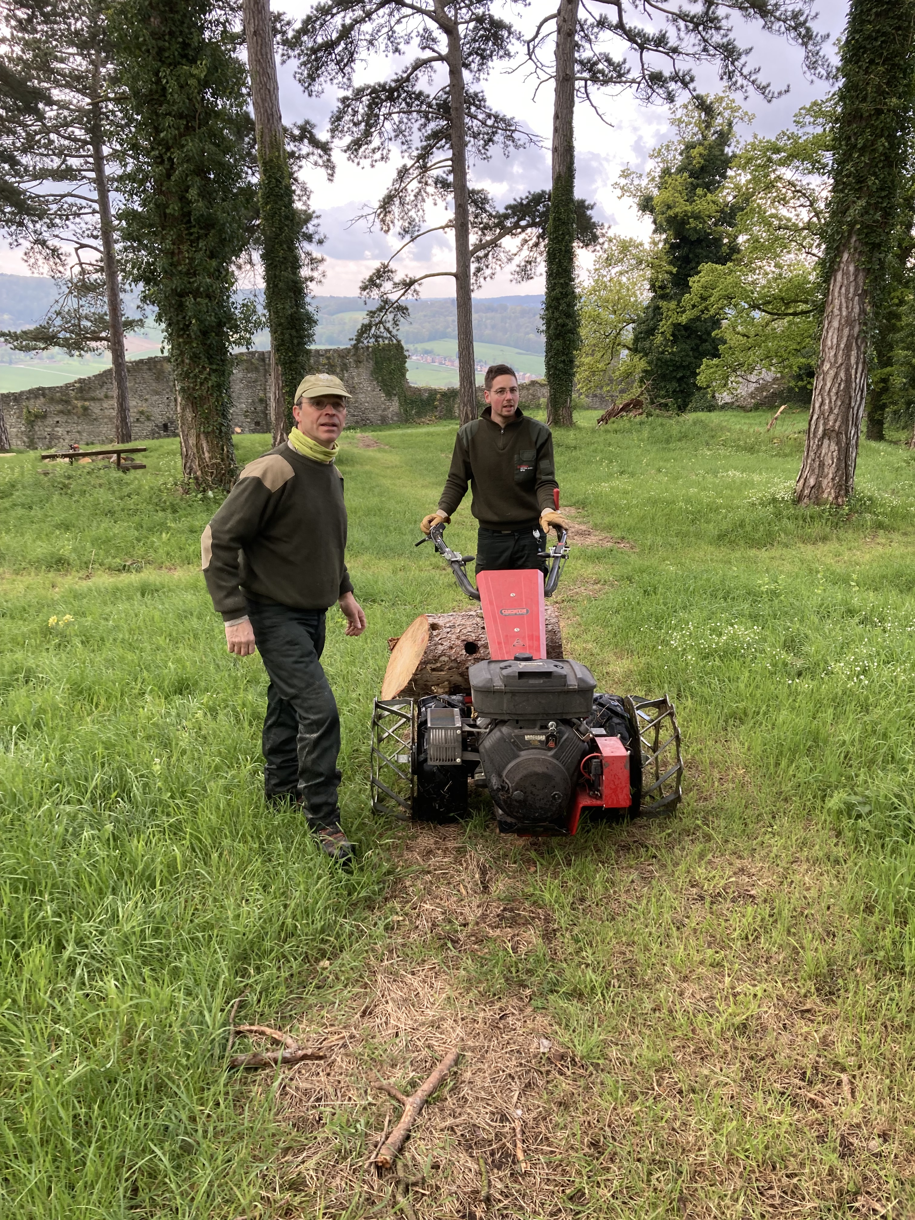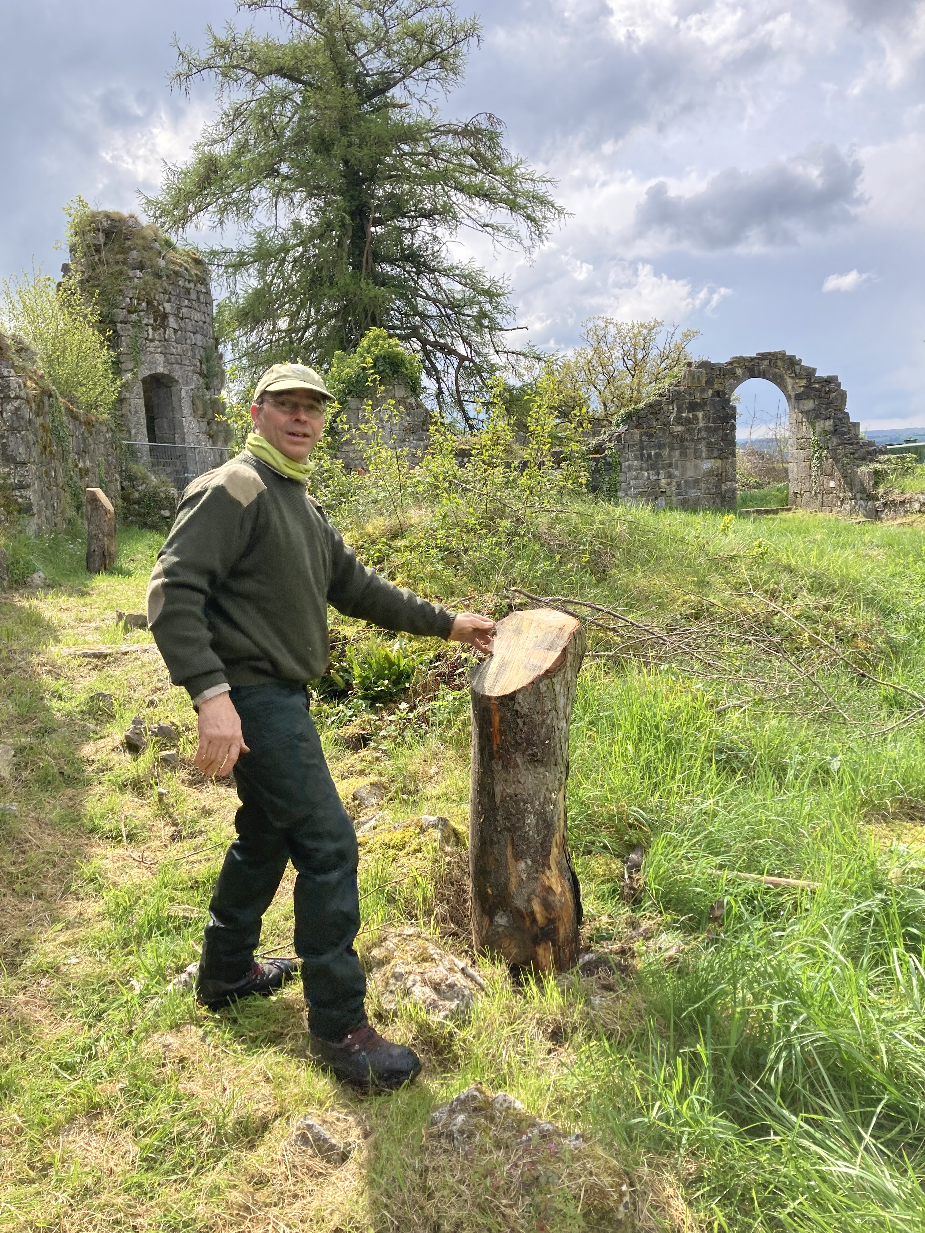 La DNF est satisfaite de pouvoir valoriser les bois qu’elle se devait d’abattre dans les ruines vu leur état. Les ouvriers sont venus nous aider aujourd’hui à placer une bonne trentaine de billons à travers tout le site : 300m de long à 60-90m de large pour rappel. Nous avons fait quelques kilomètres. Ces troncs serviront de support au QRCodes soutenant la visite. Les plaquettes devraient arriver sous peu.