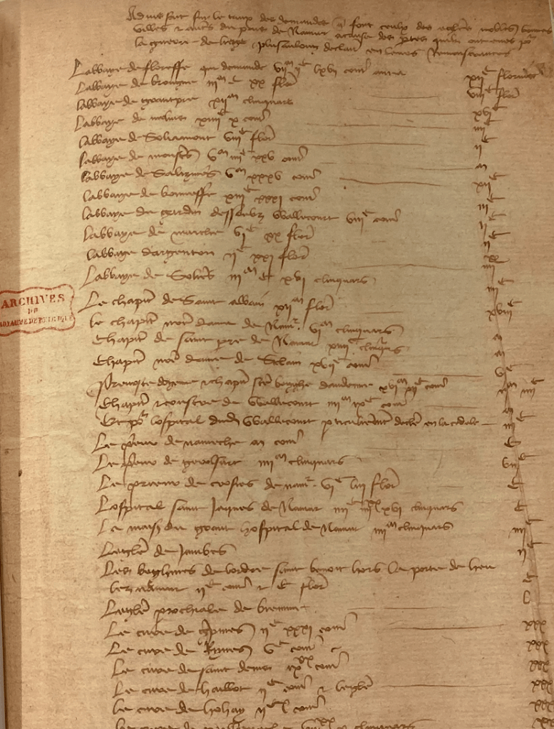Dans le dernier volume de la revue publiée par la Société archéologique de Namur, un article nous intéresse particulièrement, celui écrit par Emmanuel Bodart et Antoine Bonnivert sur « l’après-guerre namuroise (1429-1431) : l’apport de 2 comptabilités inédites des chambres des comptes ». Ces deux documents leur permettent de confirmer ou nuancer les hypothèses formulées par de nombreux autres historiens sur cette guerre et d’en préciser les conséquences économiques directes, comme particulièrement l’utilisation faite par le duc de Bourgogne de l’imposante amende infligée aux Liégeois au terme de cette guerre namuroise que le Traité de Malines le 15 décembre 1431 arrête. Ces deux petits documents de comptes conservés dans le colossal fonds d’archives de la Cour des Comptes, qui n’avaient jusqu’ici pas été vraiment étudiés par les historiens, dressent la liste des personnes namuroises qui ont reçu une certaine somme, se partageant ainsi l’amende infligée.