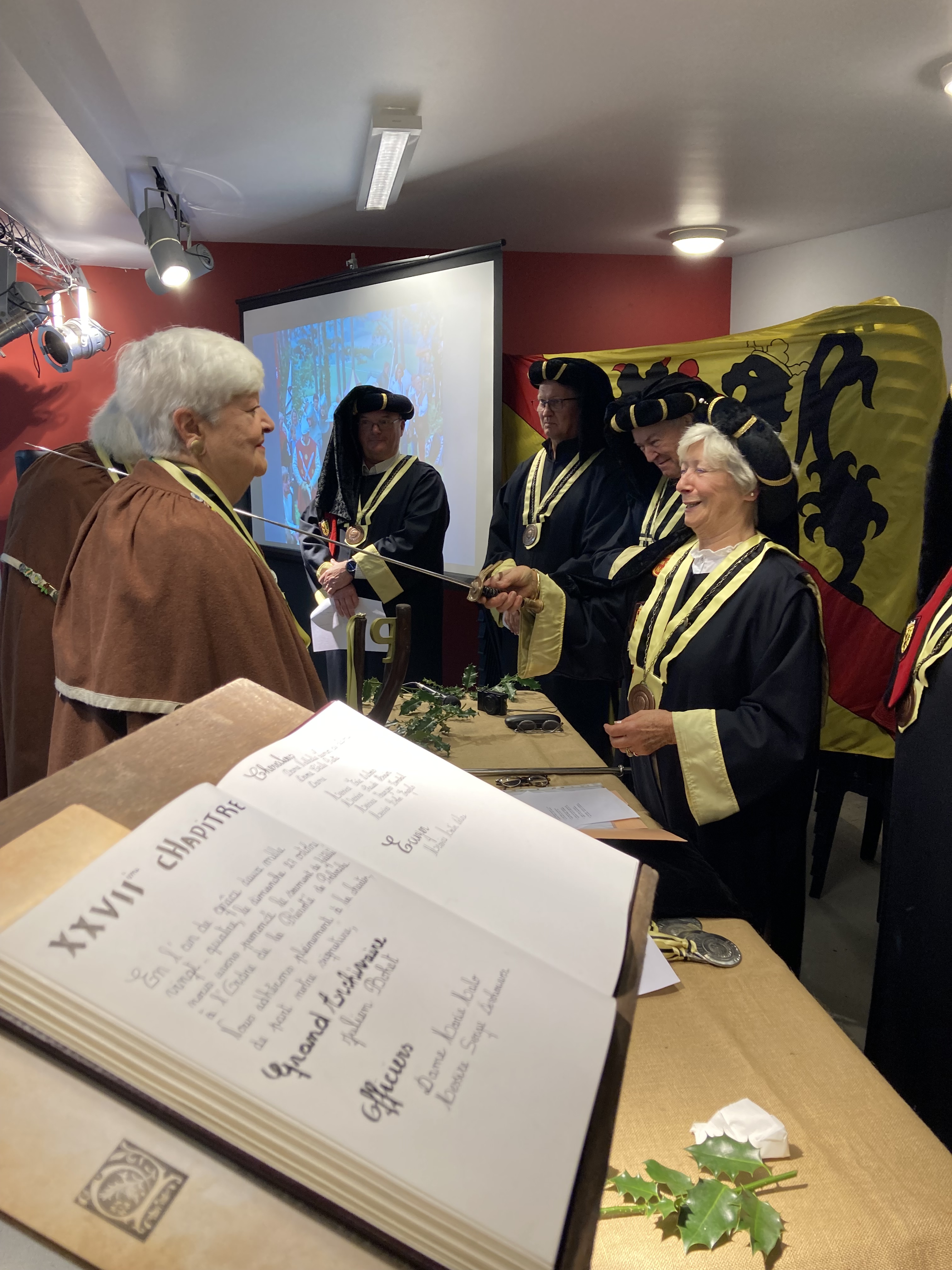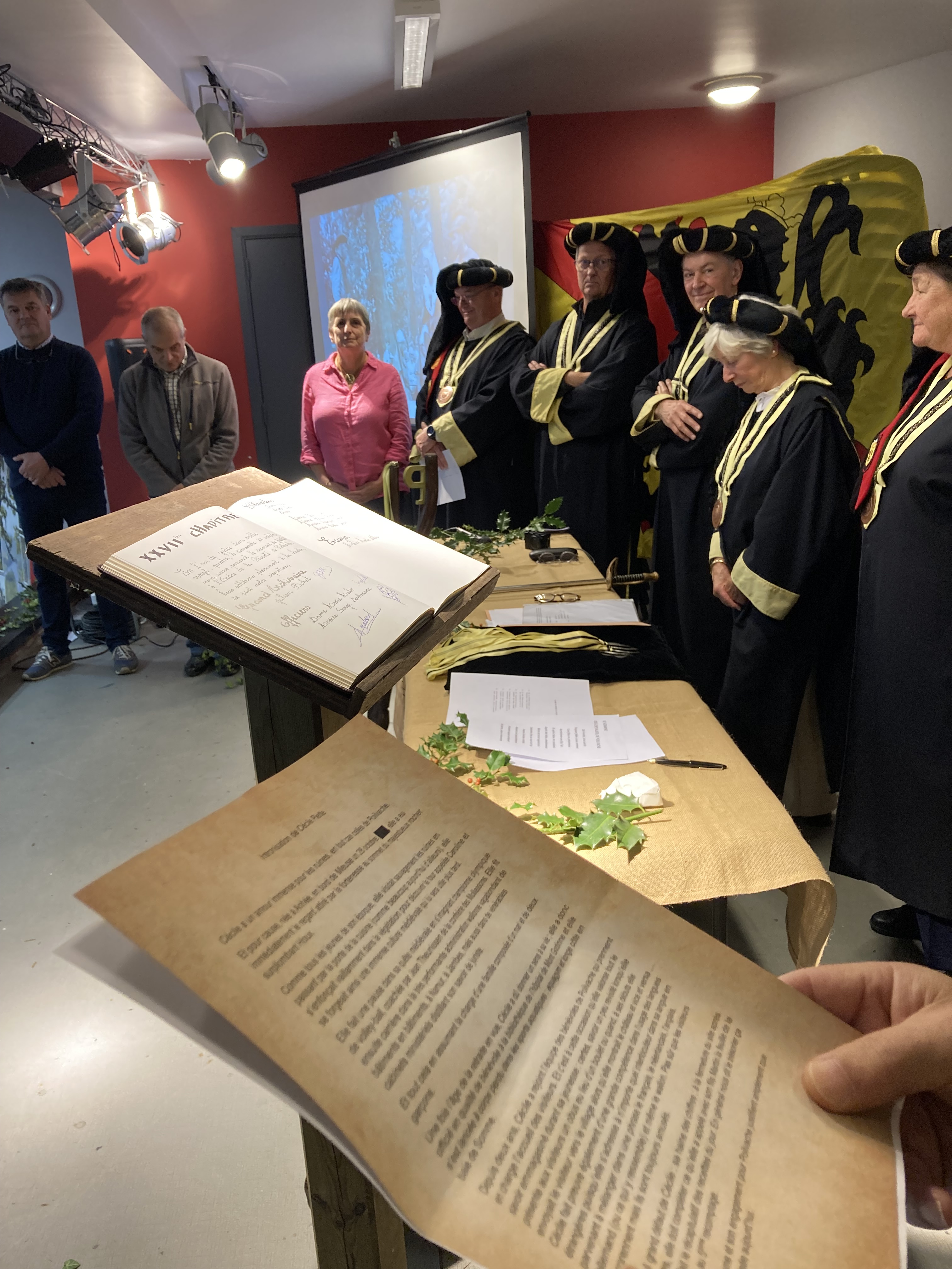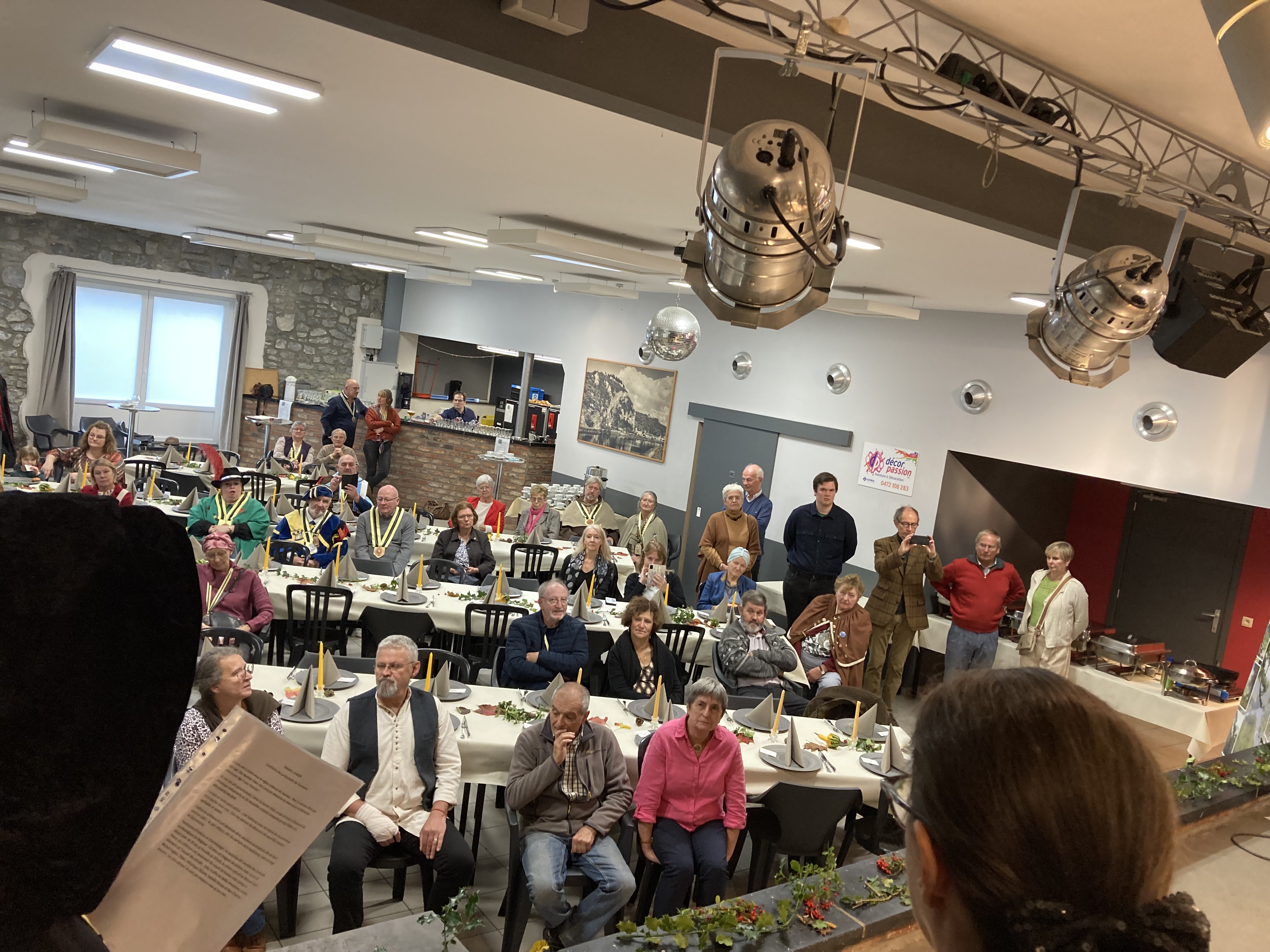 Le 27e Chapitre de l’Ordre de la Prévôté, qui se voulait intime, s’est tenu ce dimanche 27 octobre dans la nouvelle salle Saint-Barthélemy de Houx. Nous ne voulions prendre aucun risque avec la météo … belge. L’ambiance était conviviale. Nous avons bien bu. Nous avons bien mangé. Nous avons bien ri. Les discussions traitaient souvent de l’envie de protéger les ruines des affres du temps et de l’impossible action des administrations. C’était aussi l’occasion de créer des projets pour les années à venir. La liste des intronisés, des Confréries invitées, les discours, les anecdotes seront à lire dans le prochain numéro de notre périodique.