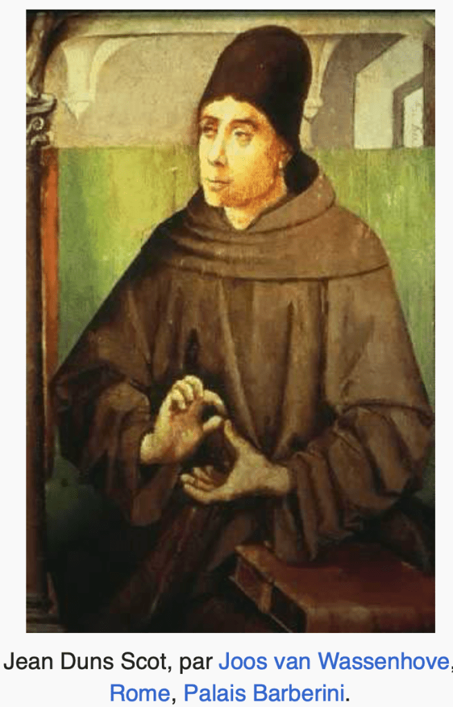 Jean Duns Scot (vers 1266 à Duns – 1308 à Cologne), surnommé le « Docteur subtil », est un théologien et philosophe écossais, fondateur de l’école scolastique. Il fut la fierté de l’ordre franciscain, et influença profondément Guillaume d’Ockham. Il s’oppose donc à Thomas d’Aquin le dominicain. Trois idées fortes : 1) la différence entre Dieu et les créatures n’est pas une différence d’être comme chez Thomas d’Aquin ou Maître Eckhart, elle tient à ce que Dieu est infini et la créature finie. 2) Il a aussi creusé les notions de singularité et d’individuation. 3) L’éthique de Jean Duns Scot met l’accent sur la volonté personnelle et la charité.