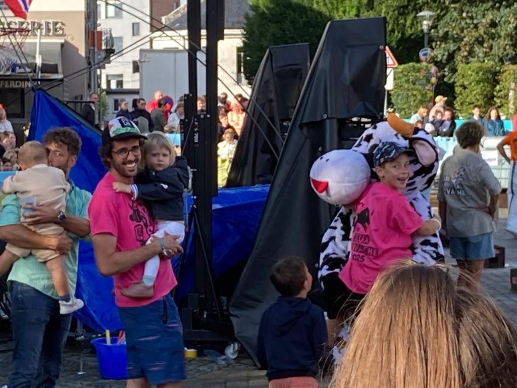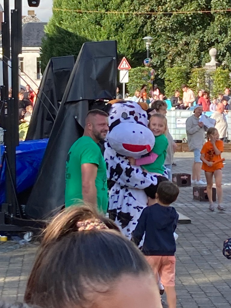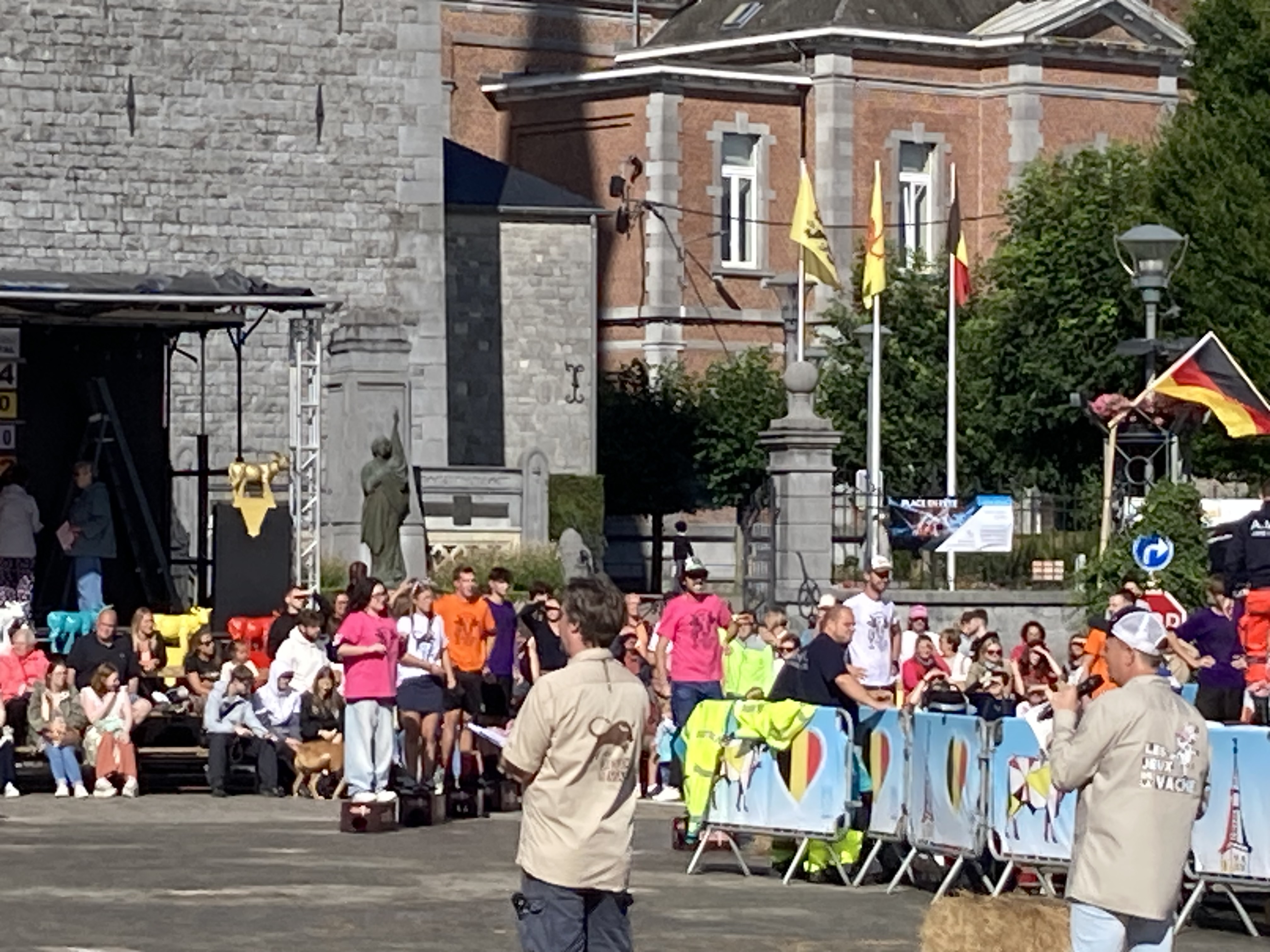 Aujourd’hui, à Ciney, c’était la 11e édition des Jeux. Les villages se disputent amicalement une « vache en or » dans différentes épreuves qui ont toutes lieu sur la Place Monseu : courses d’obstacle, jeux d’eau, de stratégie, d’équilibre ou de force.
