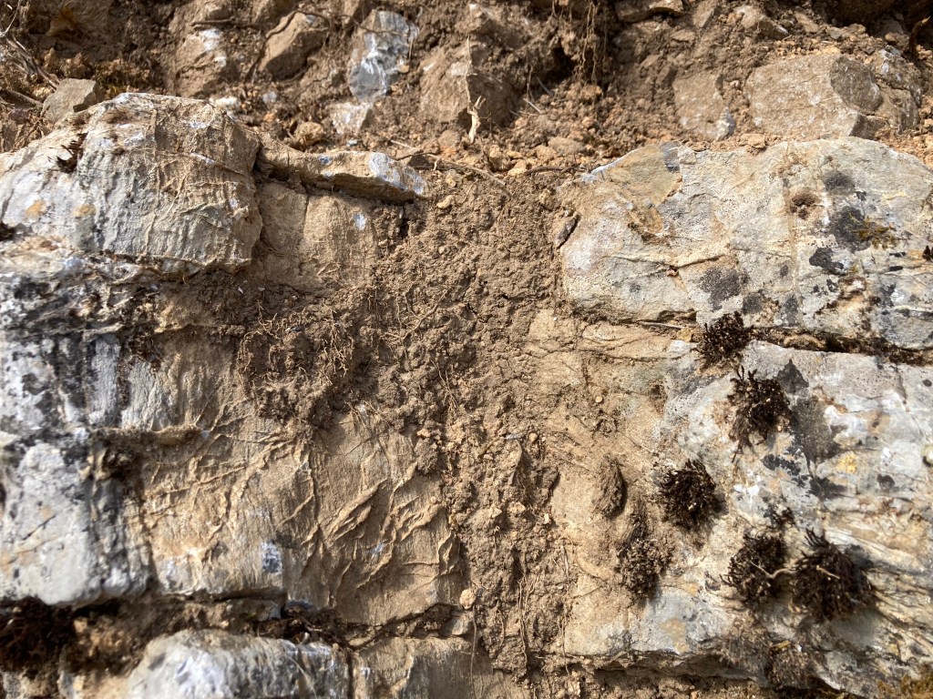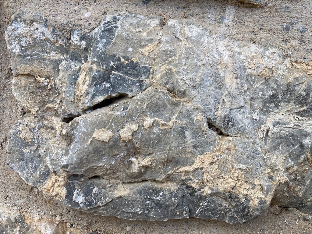 Parmi les dalles fendues, des concrétions naissent,