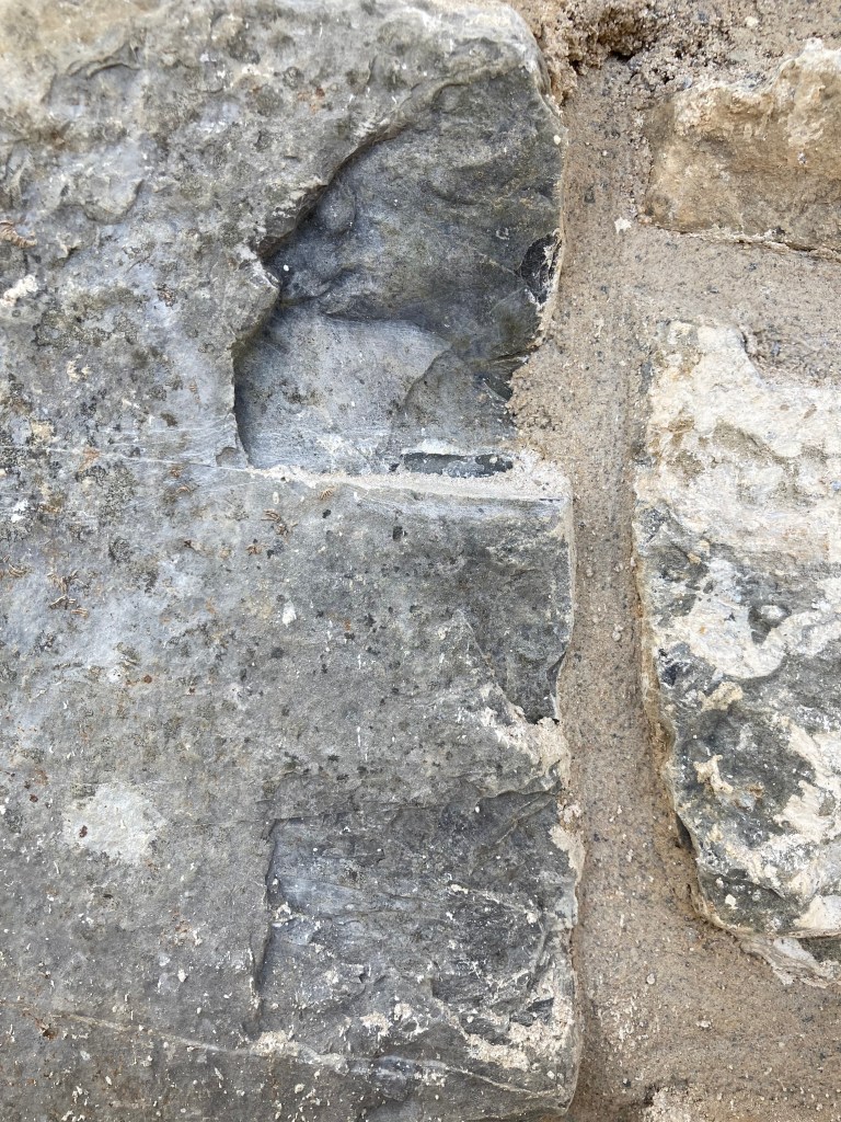 Photo © J.B. : détails du mur en train d’être restauré dans le chemin de défilement, 14 juillet 2025