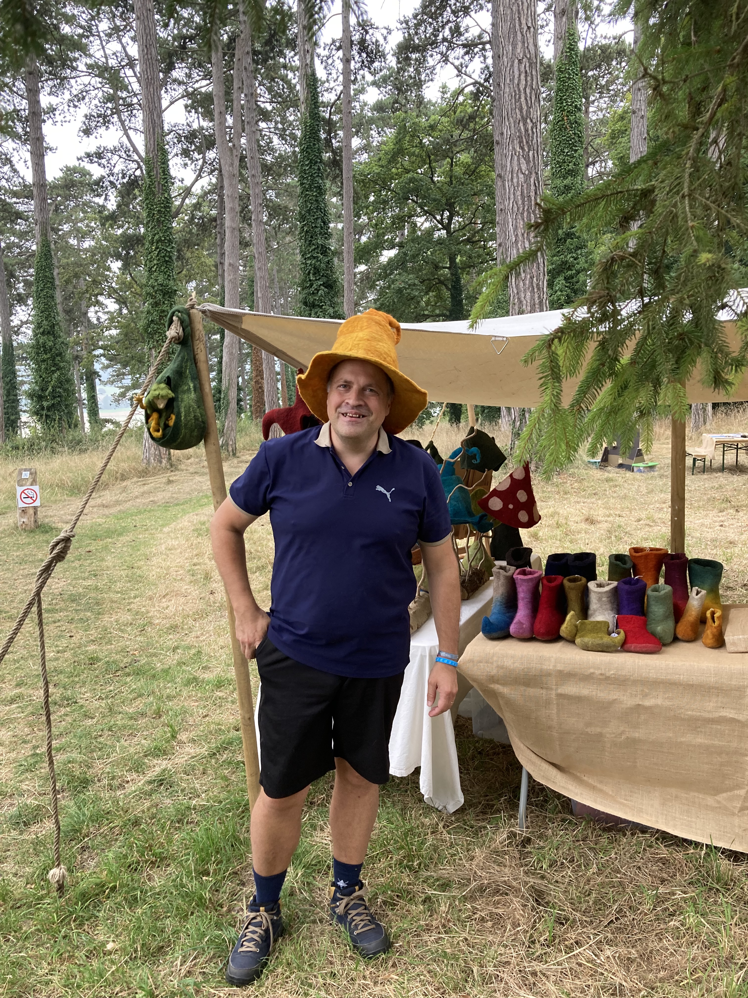 En face, Joëlle, sous le auvent, expliquait à la force du bras et du poignet comment se fabriquer les chaussons et autres bonnets pour se préparer aux saisons fraîches à venir d’une technique autrement plus rapide que le tricot. Les différents modèles multicolores exposés pouvaient être essayés pour trouver « chaussures à son pied » et possiblement passer commande de cet accessoire bien utile dans les semaines à venir.
