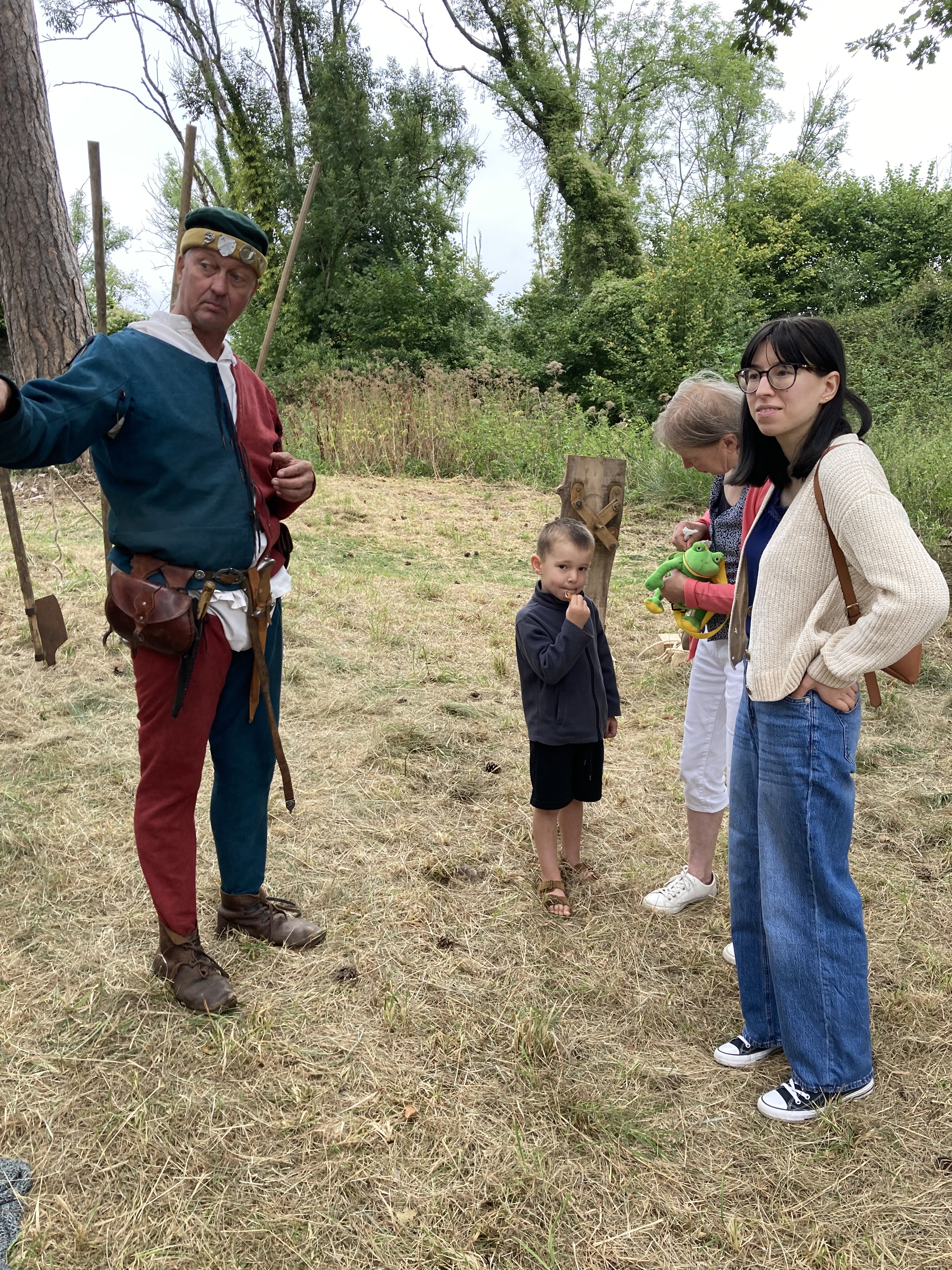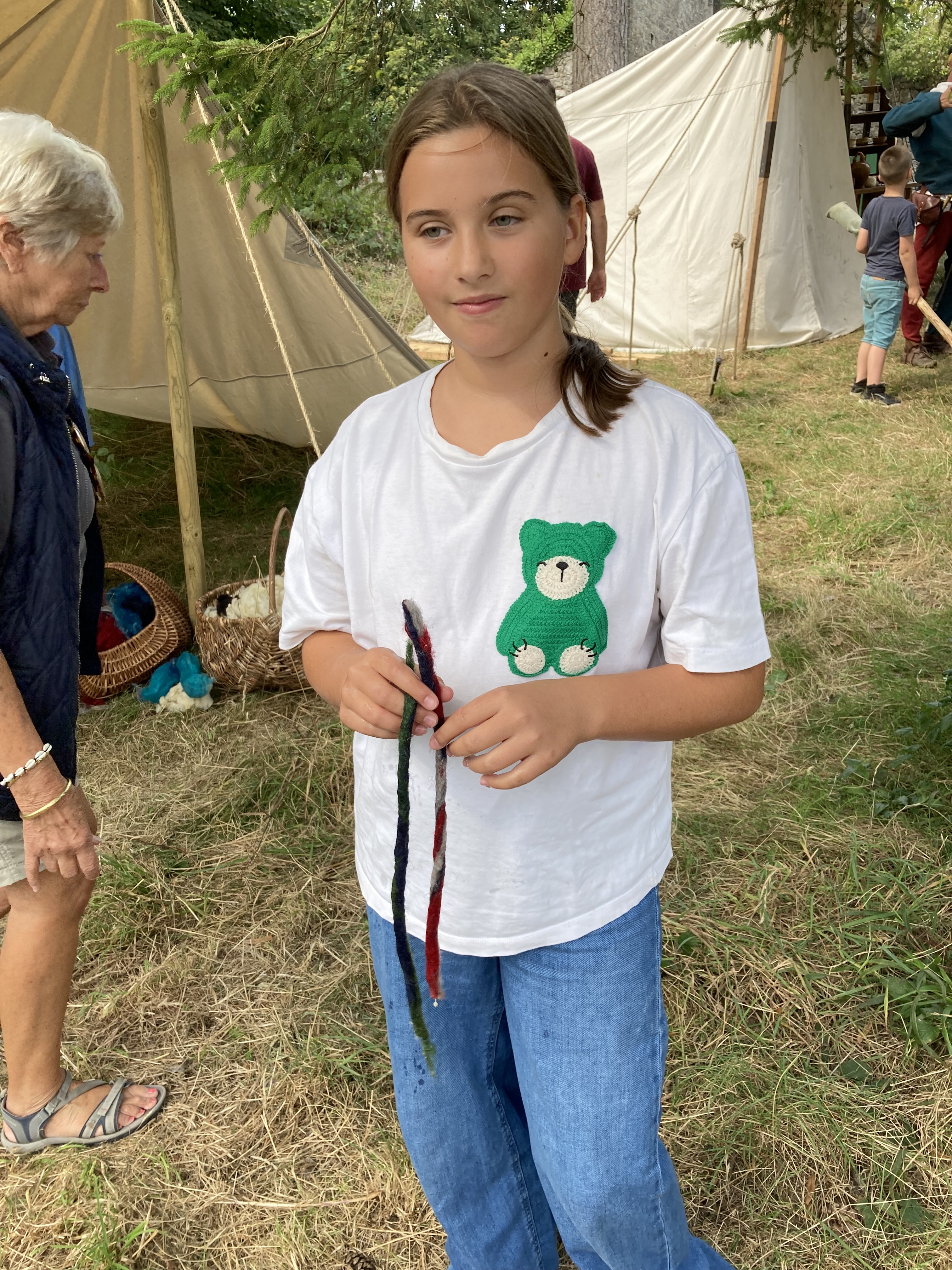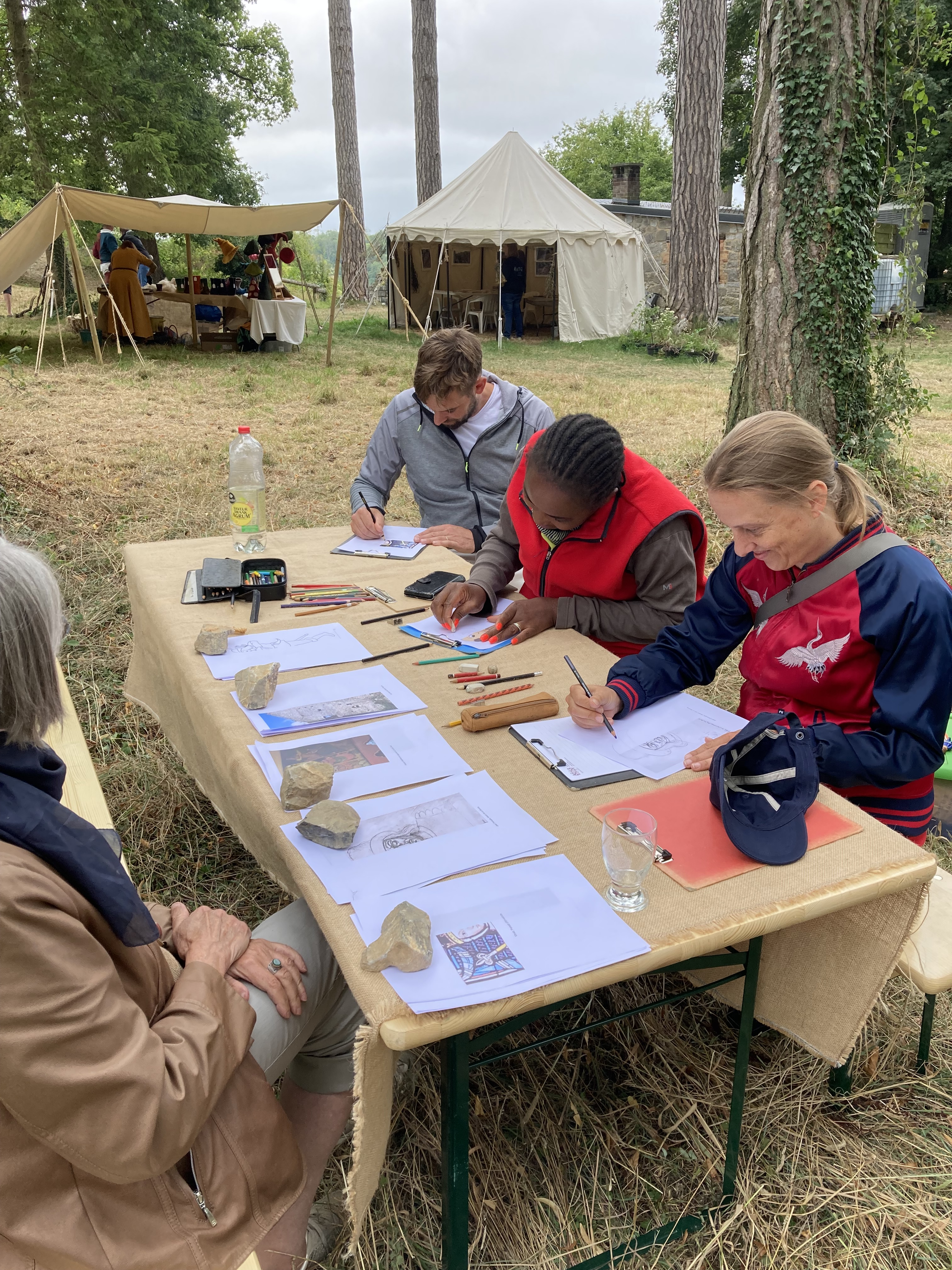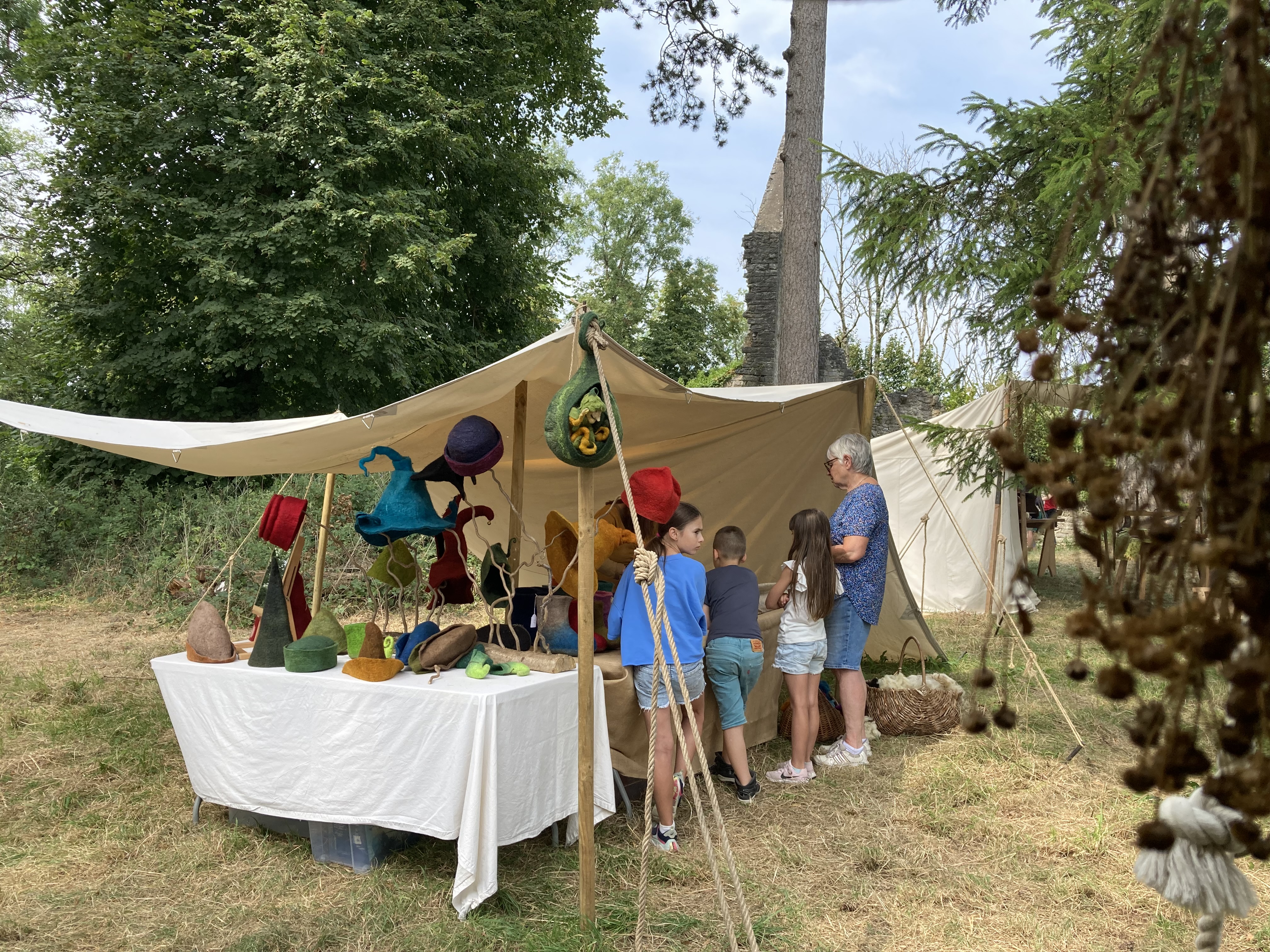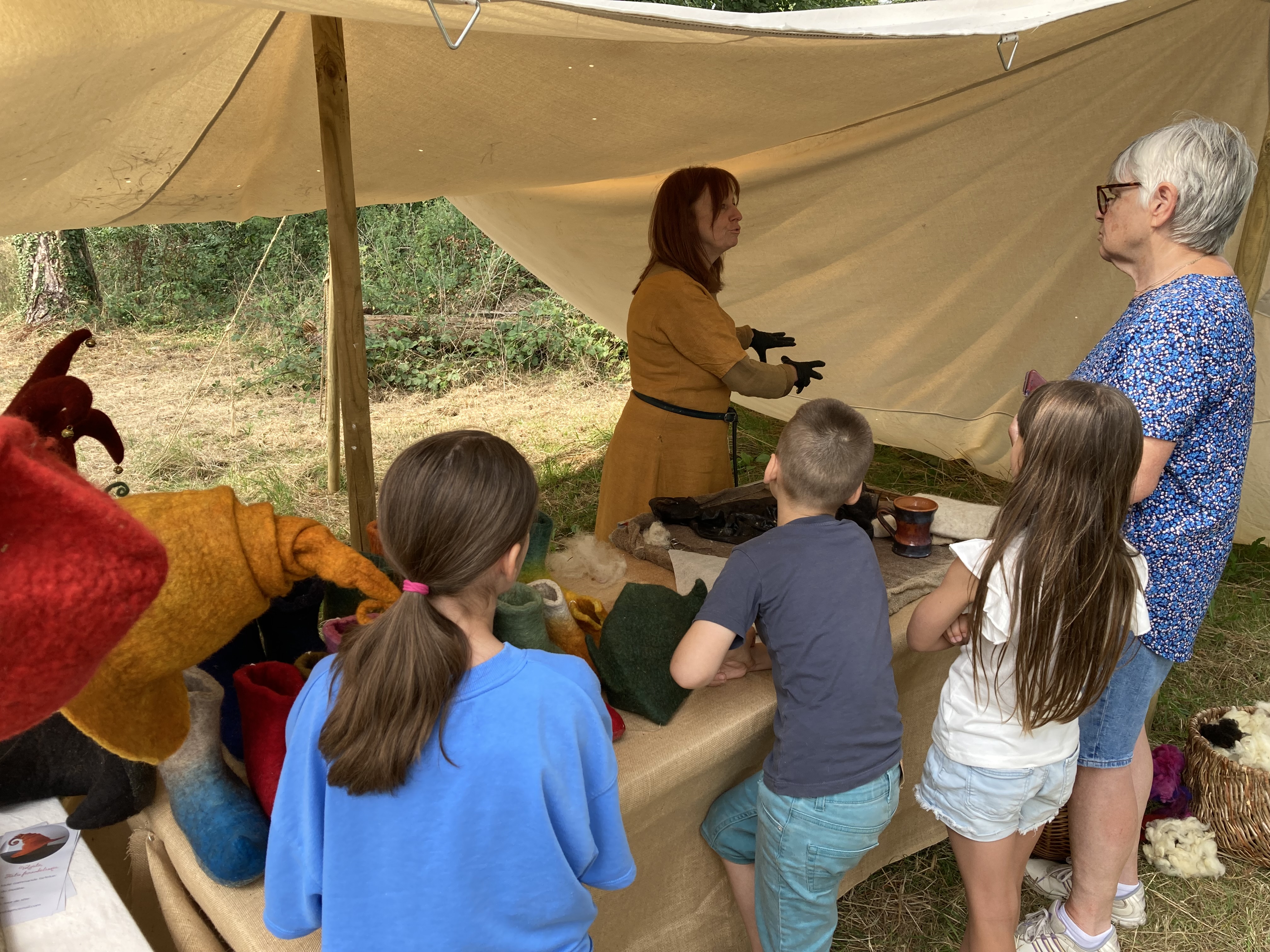 Que de monde devant la grille vers 8h30-9h ce matin : les Francs Compaings pour s’installer dans leur bivouac, l’Espace Muséal d’Andenne pour animer les carrelages en terre cuite, Joelle et son matériel de feutrage, le DNF venu faucher, le Forem pour restaurer le mur du chemin de défilement … et nous même pour les animations complémentaires !