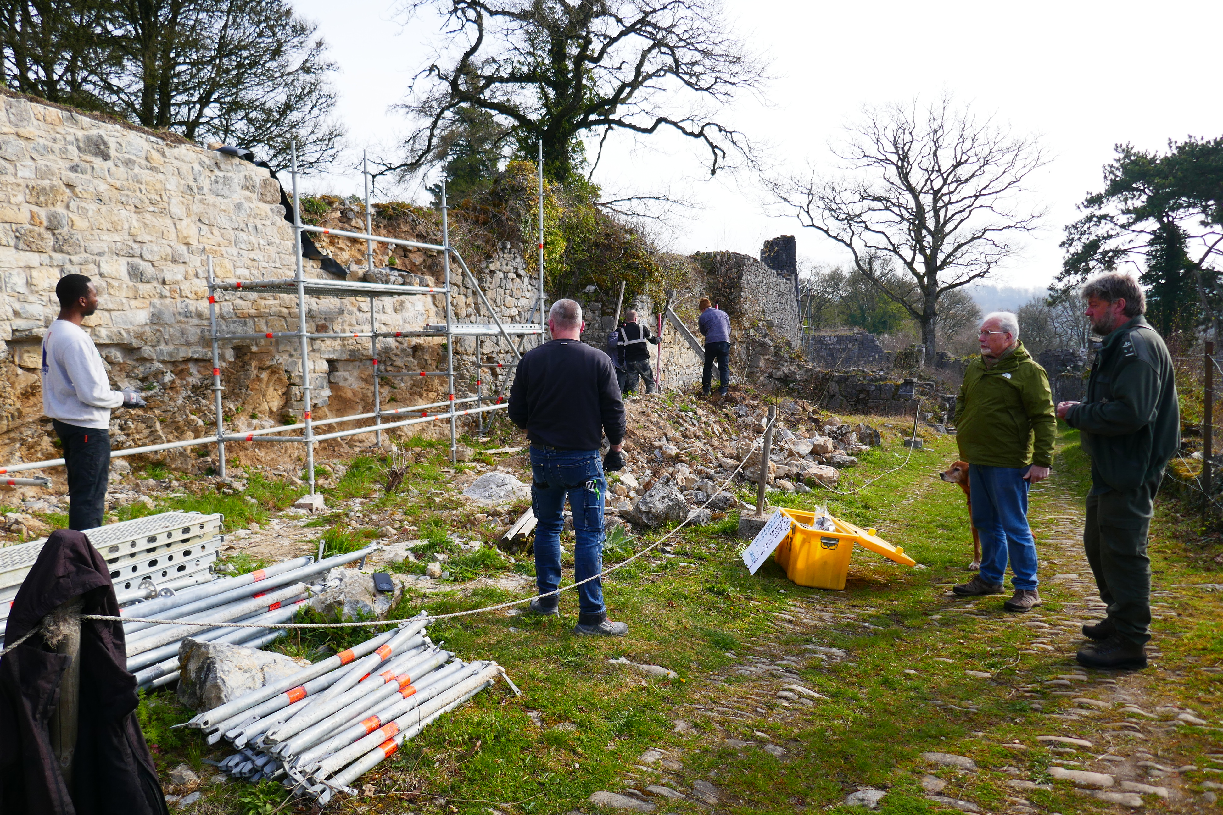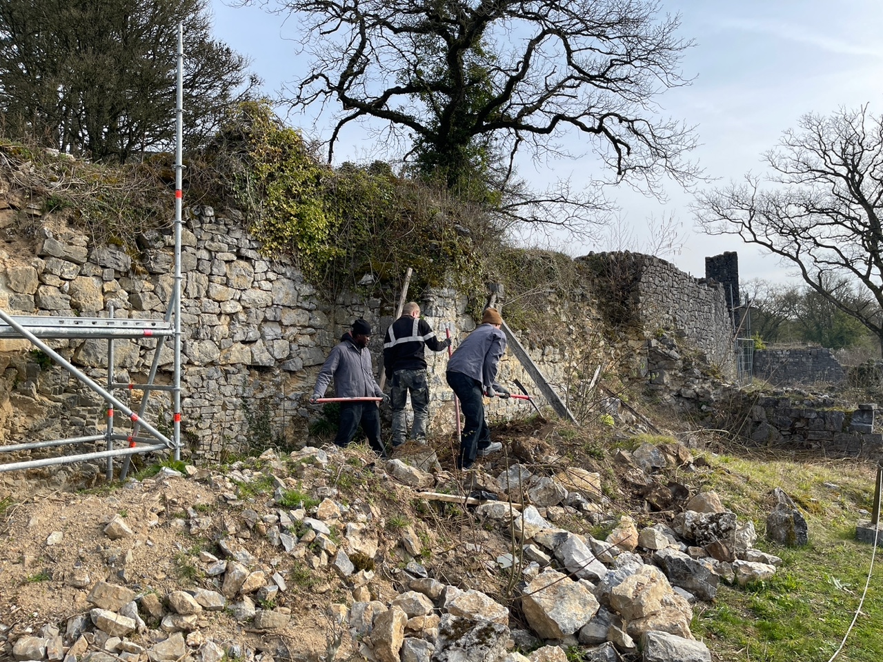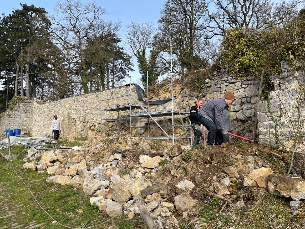 Samuel Giminne, le formateur, était lui aussi présent avec quelques stagiaires pour démonter l’échafaudage et dégager déjà la base du dernier tronçon du mur du chemin de défilement près de la 2e porte en vue de la reprise du chantier de remontage / rejointoyage dès que la météo le permettra.
