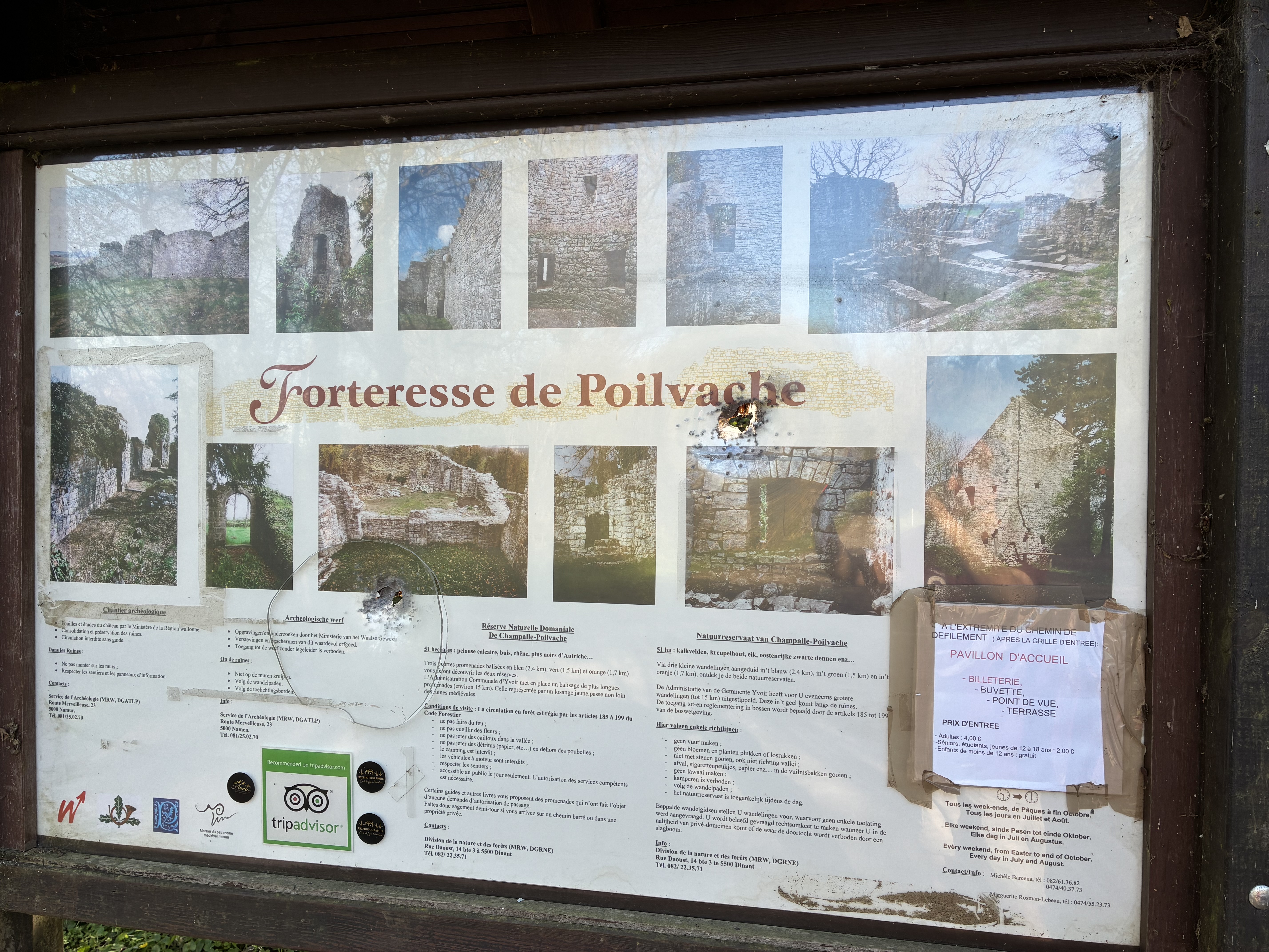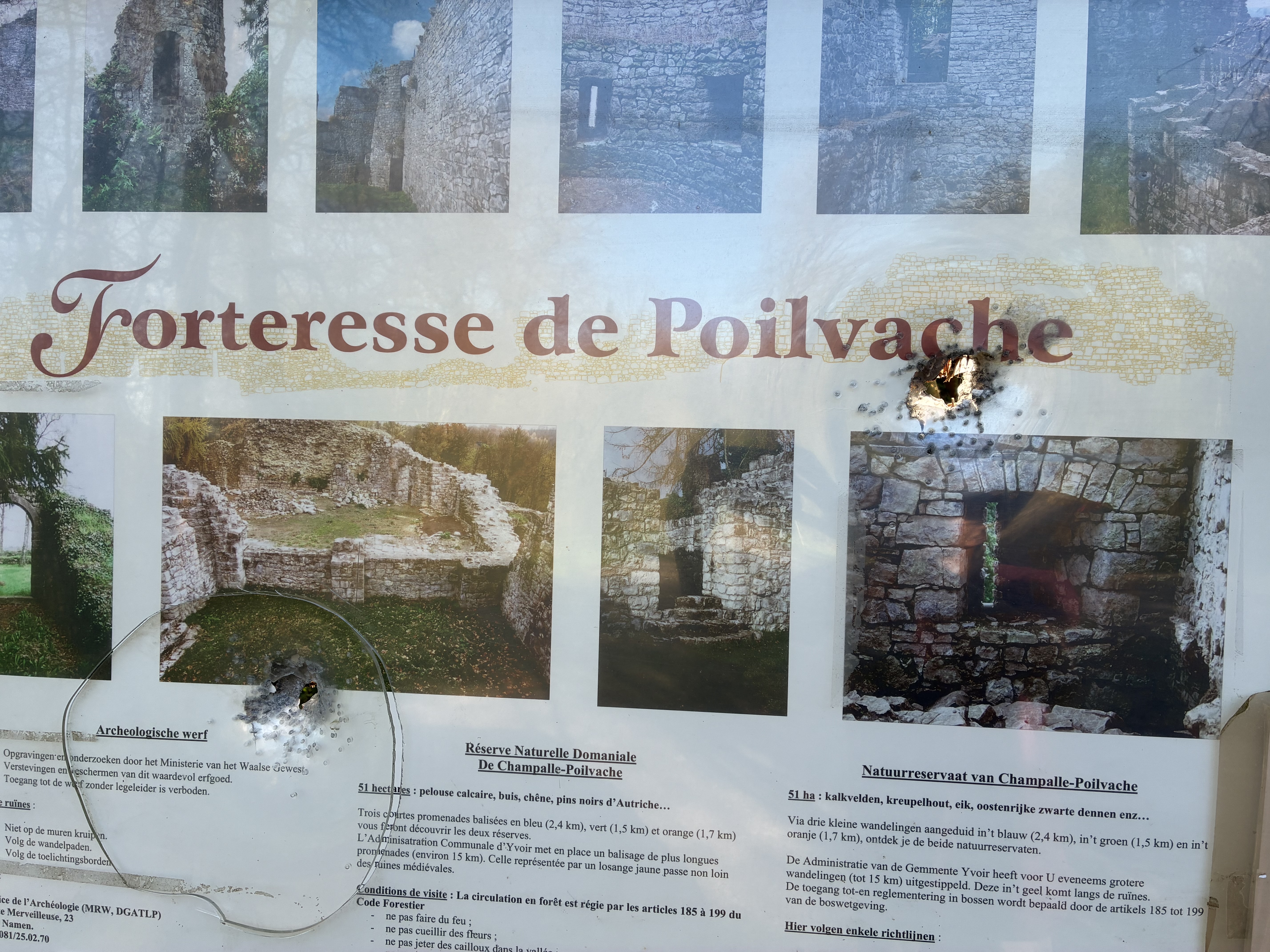 Nous tenons à vous présenter nos plus plates excuses pour cet accueil. Malgré les apparences, nous sommes bienveillants et accueillants. Nous ne chassons pas les visiteurs ne voulant pas s’acquitter du modeste prix d’entrée à coup de fusil. Ce sont sans doute des vandales ignorant où se situe le plus proche stand de tirs ou des chasseurs ne sachant pas tirer qui ont perforé de la sorte le panneau d’information sur le parking des ruines.