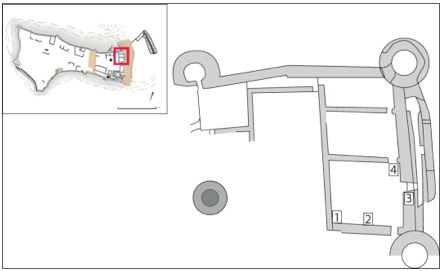 3. Consolidation du passage vers les éléments défensifs ; 4. Réfection d’une panse au niveau du parement du mur (DAO : SPW-DGO4)