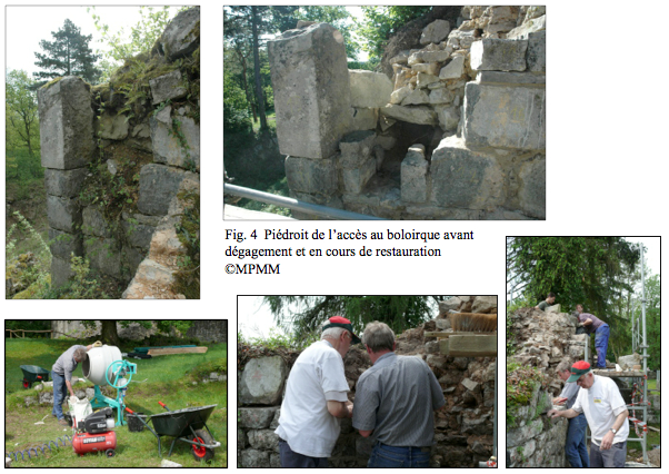 Les désordres étaient de tous ordres. La porte présentait une fragilisation importante due aux intempéries et aux affres du temps. Les murs présentaient des panses proches de l’effondrement résultat d’une percolation importante des eaux de pluie ayant entrainé une dissolution partielle des mortiers. Enfin, au niveau du passage entre la forteresse et le boloirque, l’embrasure droite présentait de sérieux désordres (effondrements, désolidarisation de la maçonnerie, etc.). La chute d’une énorme pierre du piédroit était imminente.