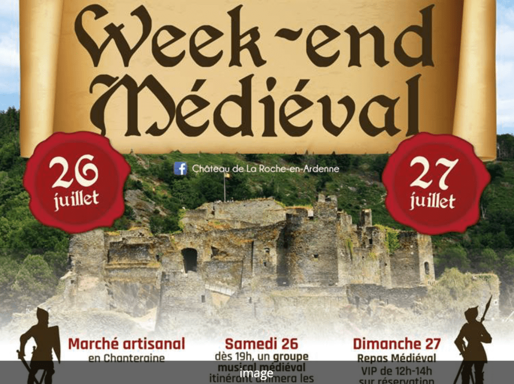 Vous festoierez les samedi 26 & dimanche 27 juillet dans le cadre de l’organisation du 𝗪𝗘𝗘𝗞-𝗘𝗡𝗗 𝗠É𝗗𝗜É𝗩𝗔𝗟 avec la compagnie de la Licorne ! Défilé en ville des artistes, l’escrime de spectacle ou artistique, saynètes, jonglerie, campements, expositions didactiques, la vie quotidienne, les ménétriers, troubadours, trouvères, action, humour, mélodies joyeuses, fauconnerie, magicien prestidigitateur, les mendiants, animations sur les jeux de tables médiévaux, un duo de musiciens (que résonnent les sonorités ardennaises), étain, la fabrication de la bougie, le saltimbanque, jongleur, … L’instrumentarium, la compagnie Fusstbuss et les Grelots du Roy ! Peut-être comprendrez-vous la légende de Berthe … Plus d’informations : info@chateaudelaroche.be