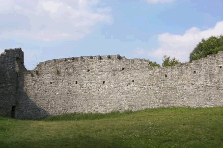 Dans le mur, on aperçoit encore des trous de boulin : l’enceinte très haute n’a pu être bâtie qu’avec l’huile de bras et des échelles permettant aux constructeurs de l’élever à 3-4 m de hauteur. Il faut y ajouter un peu d’ingéniosité : les trous de boulins servent à fixer au fur et à mesure de la construction du mur des échafaudages et des planchers en pente pour monter les pierres.