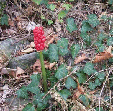 La photo est prise fin du mois d’août. Le substrat de Poilvache est constitué d’un promontoire calcaire. Ce biotope entraîne une végétation particilière : lierre, gouet tacheté (encore appelé l’arum) qui donne ces très belles grappes de fruits rouges après la perte des feuilles vertes, en forme de ‘fer de lance », la plupart tachetées de points noirs, …